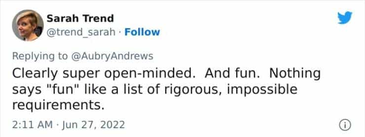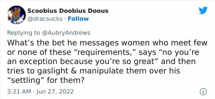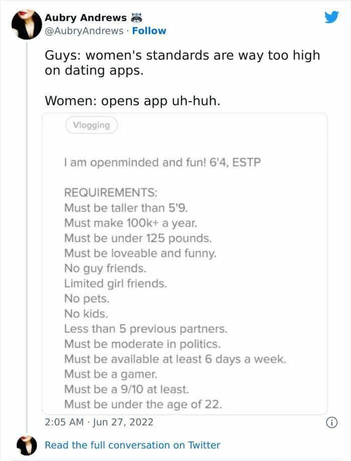 One response to “This guy has some ridiculous Tinder demands and people are not having it (THREAD)”