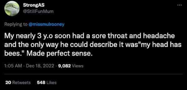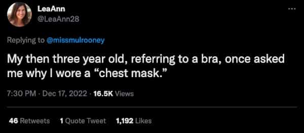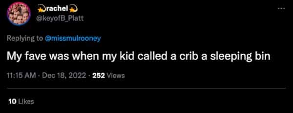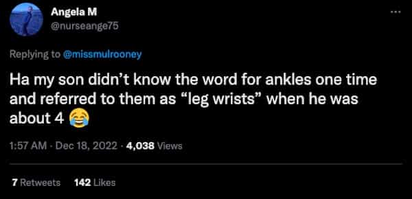 My son called a bra a boob bag and when his eye was twitching he said his eye was beeping- took a minute to figure that one out