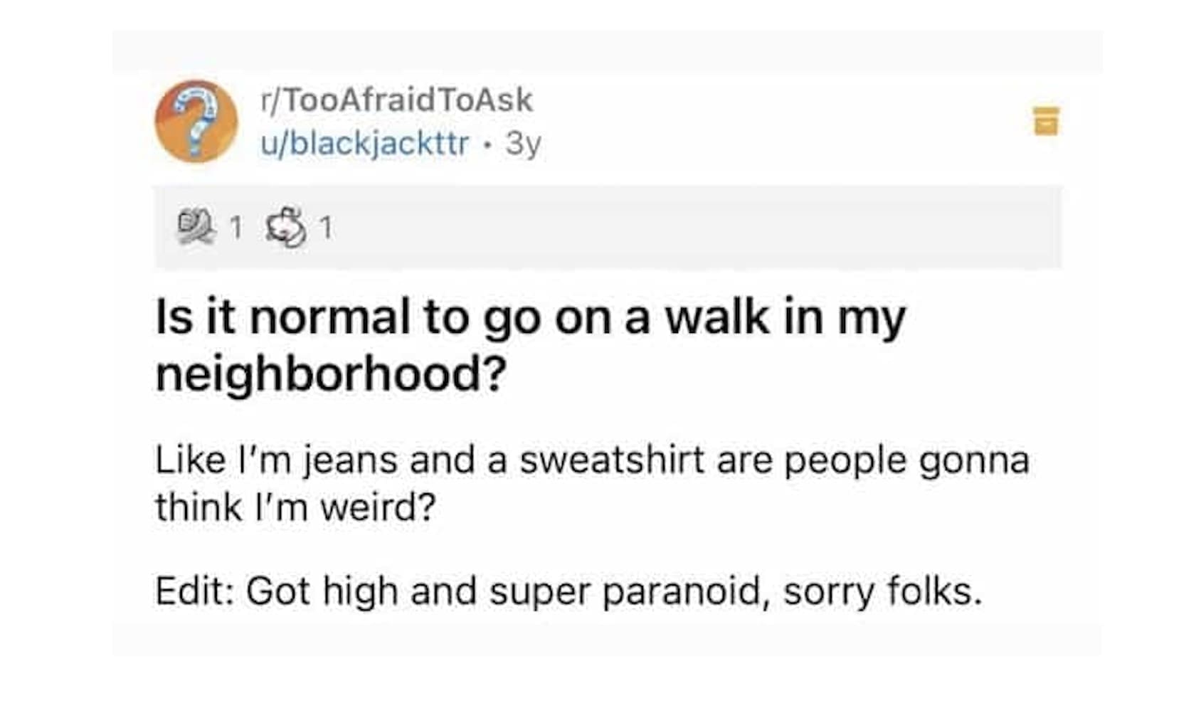 Is it normal to go on a walk in my neighborhood? Like I'm jeans and a sweatshirt are people gonna think I'm weird? Edit: Got high and super paranoid, sorry folks.