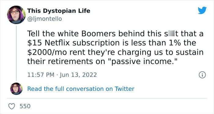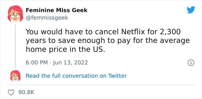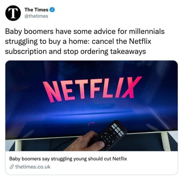 One response to “Millennials Are Roasting Boomers Who Are Saying We Could All Have Houses if We Just “Quit the Netflix””