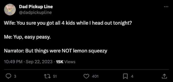 And there you have it, folks, a glimpse into the whirlwind world of parenting as told by the brave souls on Twitter. These tweets not only provide a cathartic release for tired parents but also create a sense of camaraderie among those navigating the labyrinth of parenthood. As we bid adieu to this collection of parental wit, let's raise a metaphorical sippy cup to the moms and dads who find humor in the chaos, turning everyday trials into comedic gold. Parenting, after all, is not just about surviving the toddler years but also cherishing the absurdity that comes with it. So here's to the diaper-changing warriors, the snack-fetching champions, and the bedtime story maestros – you're doing an incredible job, and your tweets remind us all that laughter is the secret sauce that makes parenting an unforgettable, albeit messy, adventure.