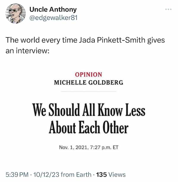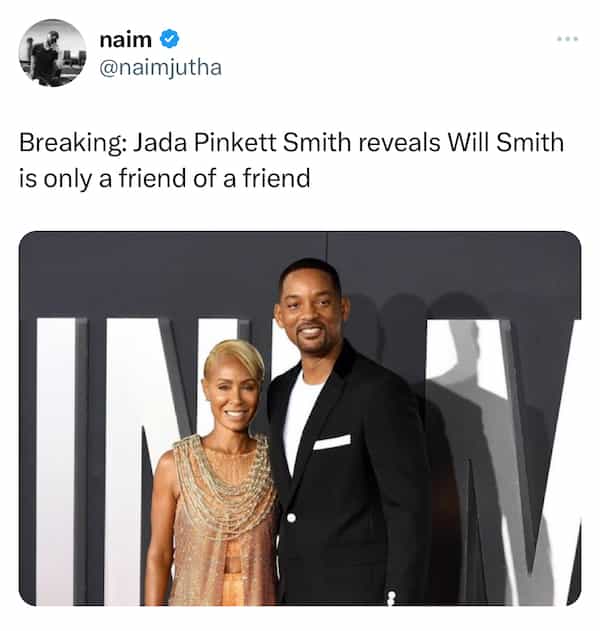 Lights, camera, comedy! In this sidesplitting post, we've curated 21 memes that hilariously capture the whirlwind of drama surrounding Will Smith, Jada Pinkett Smith, and the fact that Jada has said the couple is not together and haven't been for years. . Hollywood's power couple has become the unintentional stars of the internet's meme universe, and we're here to showcase the best of the best. From witty takes on their relationship to side-splitting interpretations of infamous moments, these memes are a riotous commentary on the glamorous world of showbiz. As we dive into this collection, prepare to witness the creative brilliance of meme-makers who can turn even the most intense moments into laugh-out-loud hilarity. So, grab your popcorn and get ready to chuckle your way through Hollywood's most meme-worthy escapades!