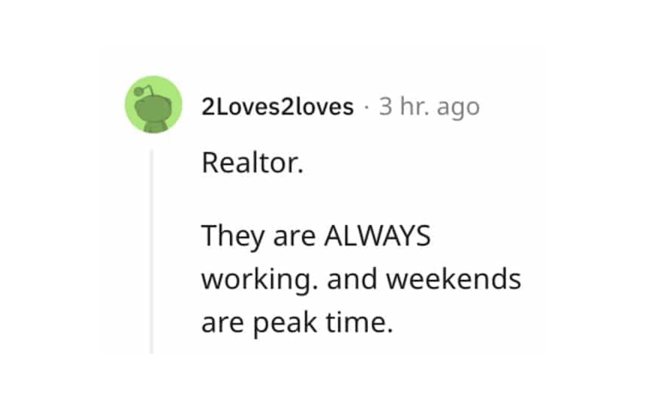 red flag jobs Realtor. They are ALWAYS working. and weekends are peak time.