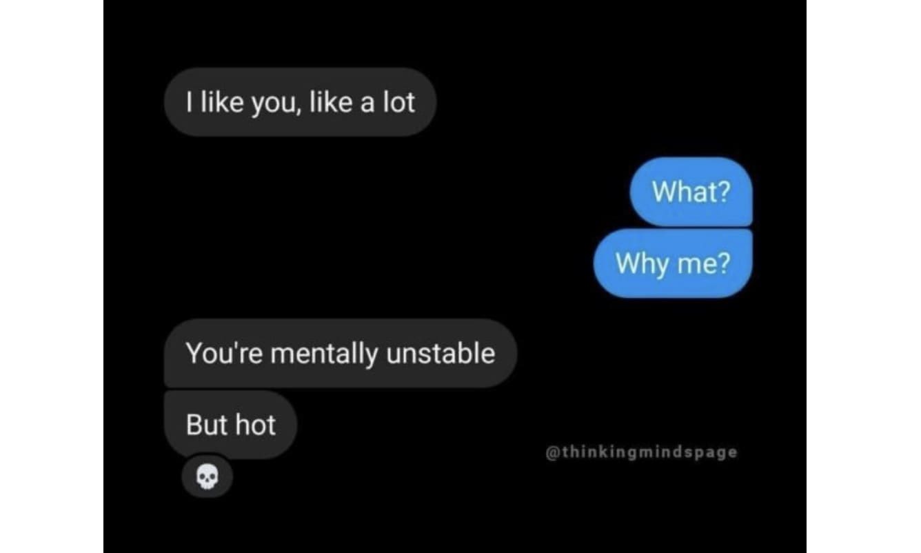 funny pics I like you, like a lot What? Why me? You're mentally unstable But hot