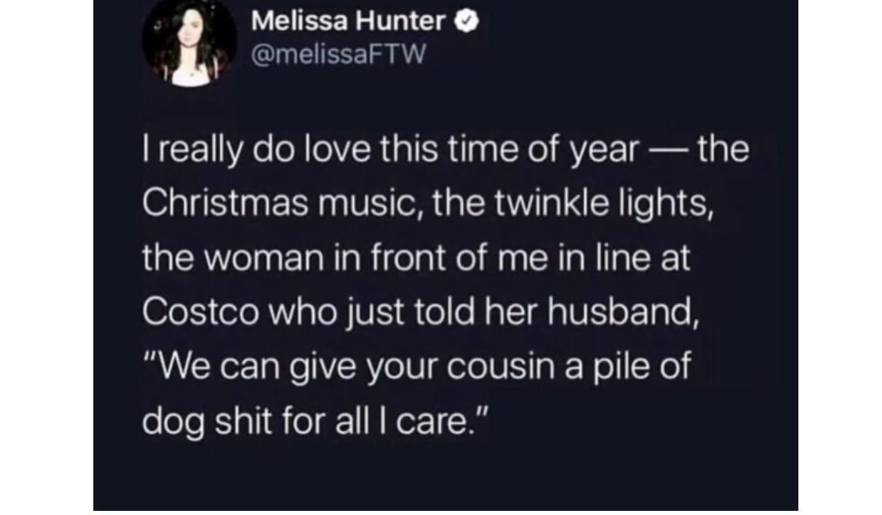 funny memes I really do love this time of year — the Christmas music, the twinkle lights, the woman in front of me in line at Costco who just told her husband, "We can give your cousin a pile of dog sht for all I care."
