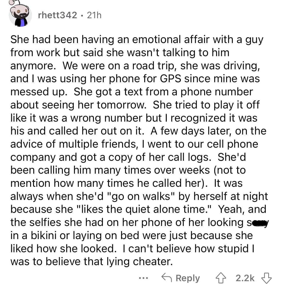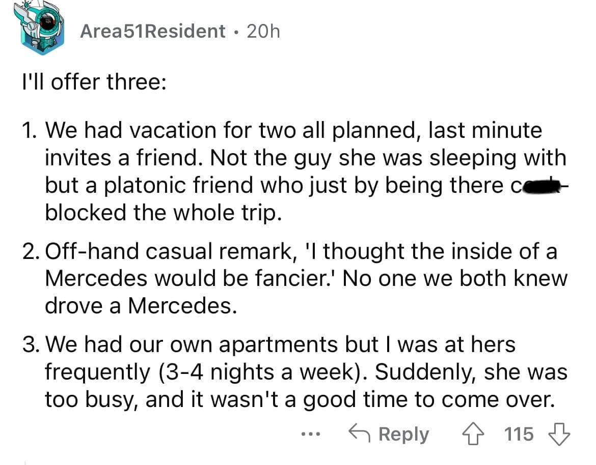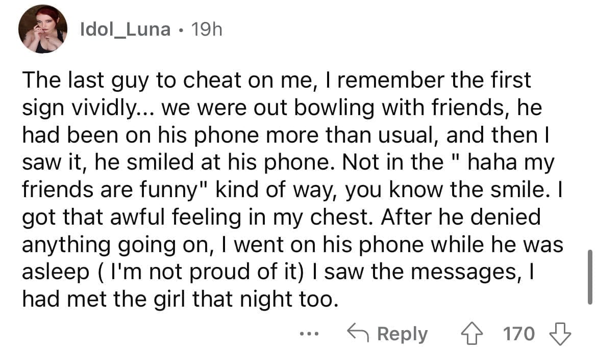 Cheating red flags Phone bill showed she was texting this other number 600 a month. It looked familiar so when I dialed it it was a buddy of mine.