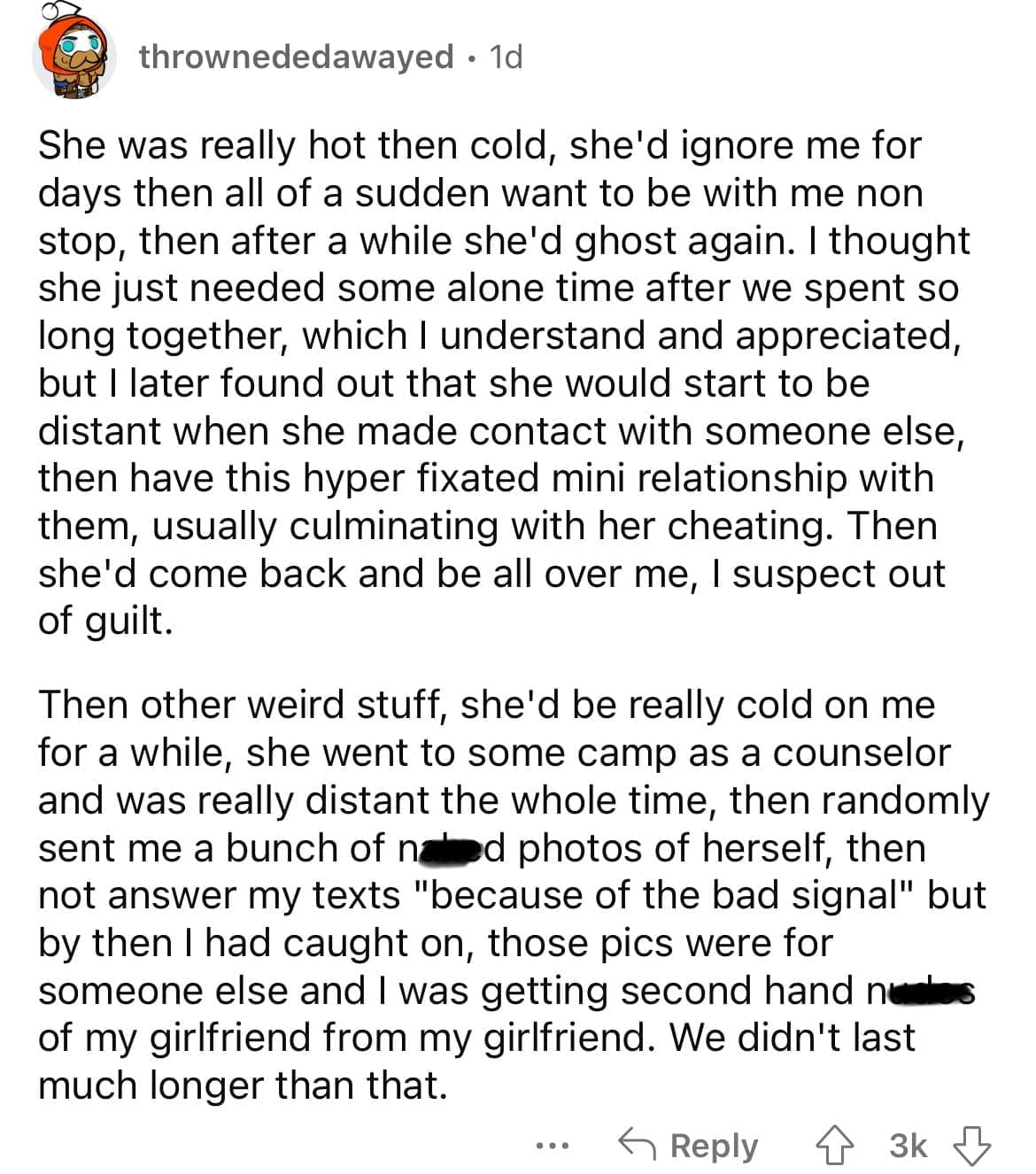 Cheating red flags Nothing. I only heard it through others a few months after we broke up over other stuff. There were no signs, no sneaky behavior, no weird things overall. Probably thats what made it the worst to deal with, the entire lack of signs.