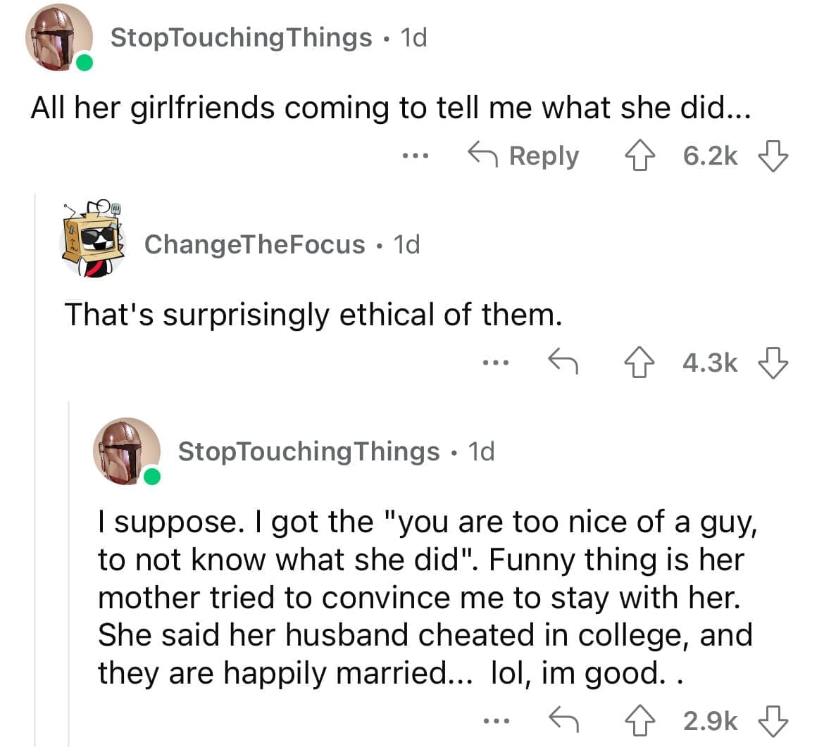 Cheating red flags An ex of mine left me at his parents to go on a date with an old friend, it was straight up a date, he tried to act like it wasn't. I was shocked and crying, his mom came in as I was getting my stuff ready to leave, and she was annoyed, said," stop that. You're the one he'll be coming home to, you have no reason to get emotional over who he does what with during the day." Welp, at least you know where he picked up being a sociopath from.