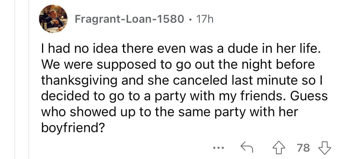 Cheating red flags I showed up at her house to suprise her after work but to my suprise a guy answered the door. Turns out he was her fiancé who was working abroad and had decided to come home early to suprise her also. I had no idea she was engaged.