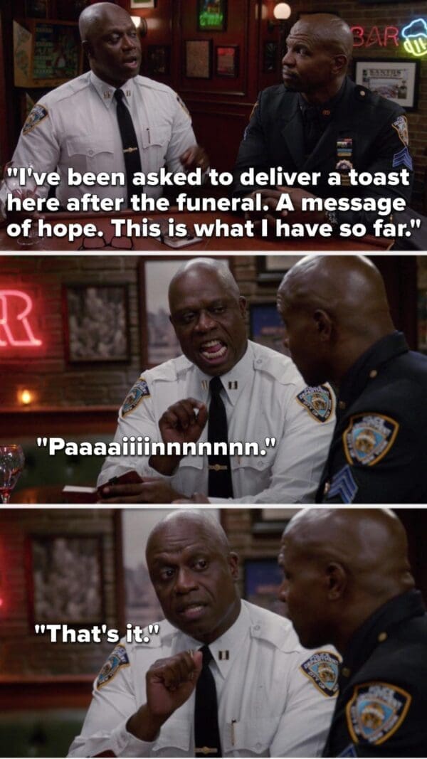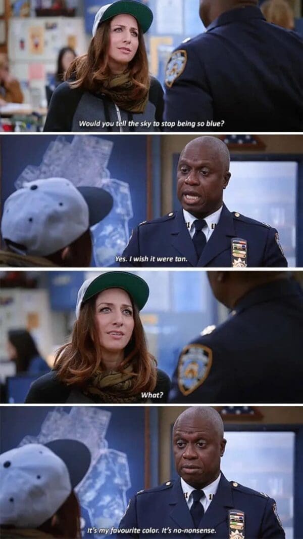 Now, let’s talk about those Captain Holt memes. The internet loves a good meme, especially when it involves someone as lively as Andre Braugher. I can’t get enough of those images featuring his dead-eyed stare and the caption, “I’m not mad; I’m just disappointed.” Really, Andre? Because most people would be in therapy for years if they encountered your level of disappointment. It’s a meme, not a therapy session, but hey, whatever helps you cope with the crippling disappointment of the human condition. And then there’s “Brooklyn Nine-Nine,” a show that managed to turn police work into a hilarious sitcom, proving that even the most serious professions can be fodder for laughter. It’s almost as if they were trying to teach us that life’s absurdity is the only thing keeping us from spiraling into existential despair. Thanks for the enlightenment, Captain Holt.