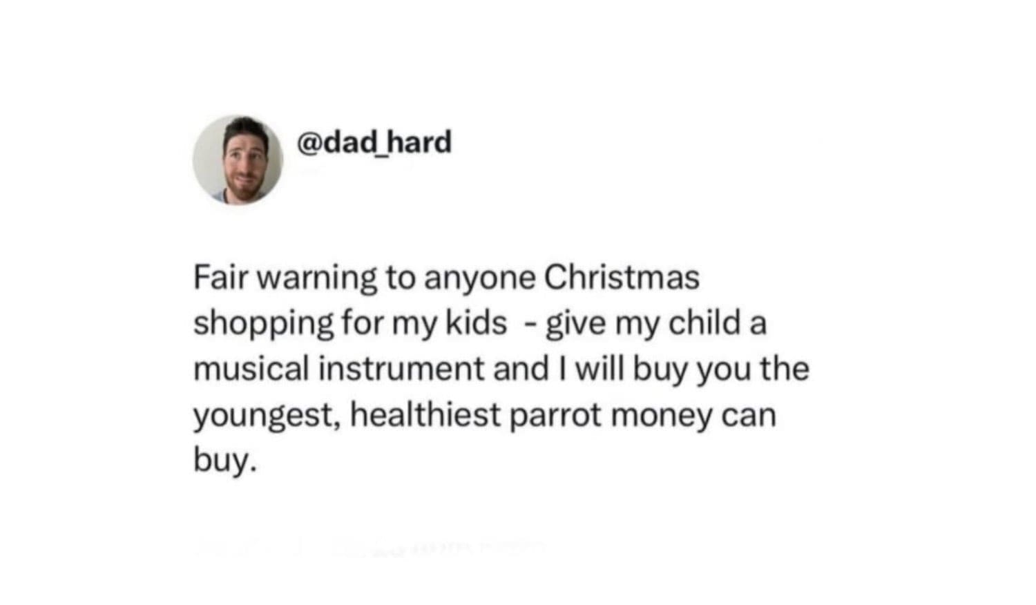 funny memes Fair warning to anyone Christmas shopping for my kids - give my child a musical instrument and I will buy you the youngest, healthiest parrot money can buy.