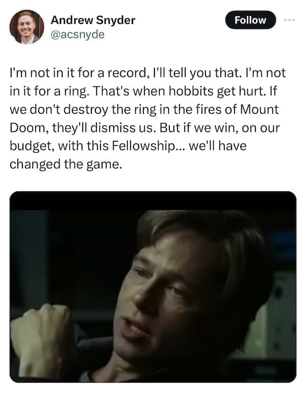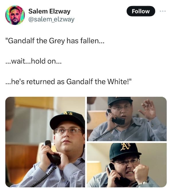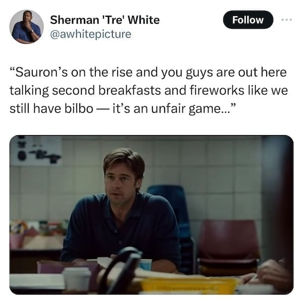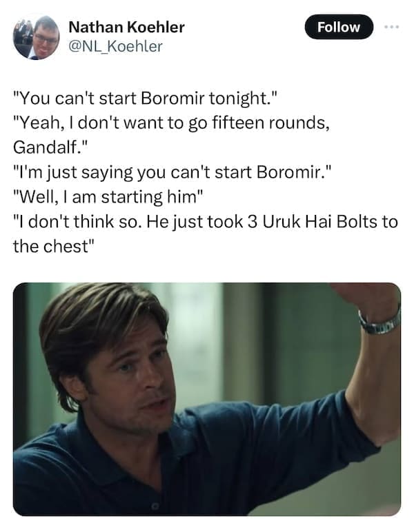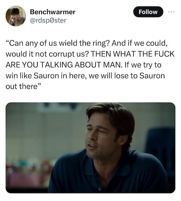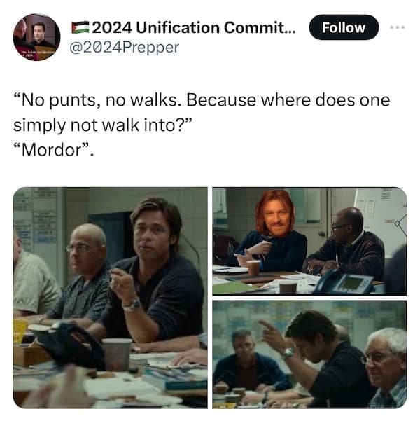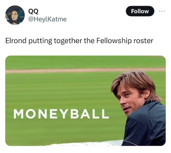 In the peculiar realm of internet humor, emerges the curious fusion of "Lord of the Rings" wisdom and the unexpected brilliance of "Moneyball" movie snapshots. Behold the uproarious symphony of wit and randomness that is the Lord of the Rings Moneybag Memes! Prepare to navigate through 15 meme marvels where iconic quotes meet Brad Pitt's unforgettable moments, seamlessly woven into laugh-inducing, oddly coherent creations. Enter the whimsical world where Gandalf's wisdom meets Billy Beane's strategic prowess. Discover 15 side-splitting meme amalgamations as internet creatives blend LOTR quotes with Brad Pitt's Moneyball scenes. Witness the internet's obsession as phrases like "You shall not pass!" collide hilariously with Moneyball's baseball drama, crafting meme magic that defies all logic yet resonates deeply with humor enthusiasts.