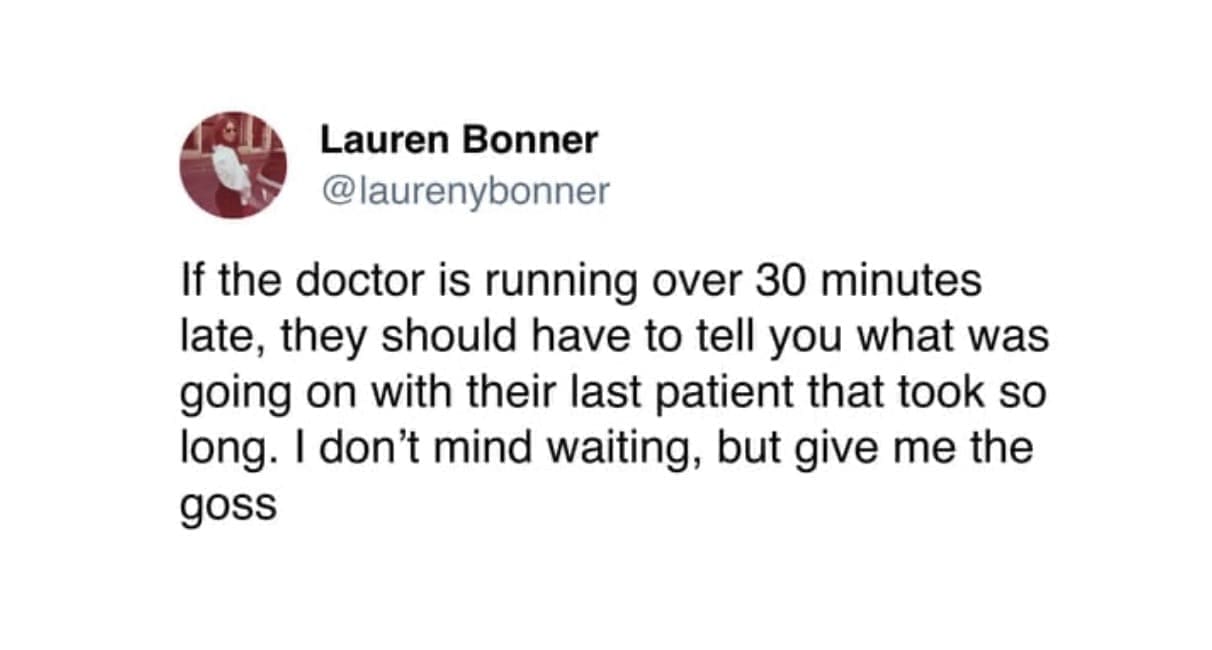 funny pics @laurenybonner If the doctor is running over 30 minutes late, they should have to tell you what was going on with their last patient that took so long. I don't mind waiting, but give me the goss