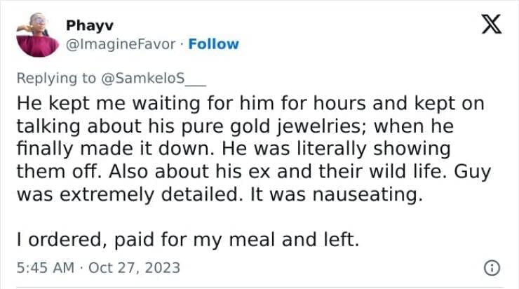 Worst first date stories We went to ocean basket, he ate his own food and proceeded to eat mine