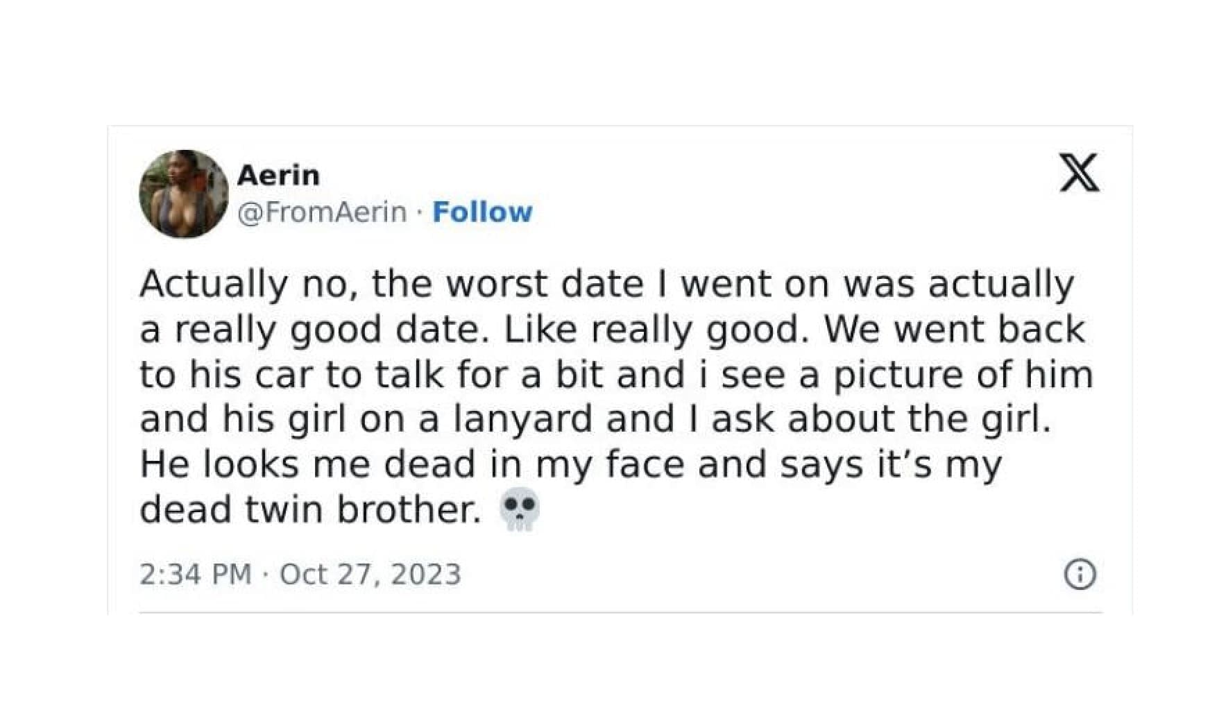 Actually no, the worst date I went on was actually a really good date. Like really good. We went back to his car to talk for a bit and i see a picture of him and his girl on a lanyard and I ask about the girl. He looks me dead in my face and says it's my dead twin brother.