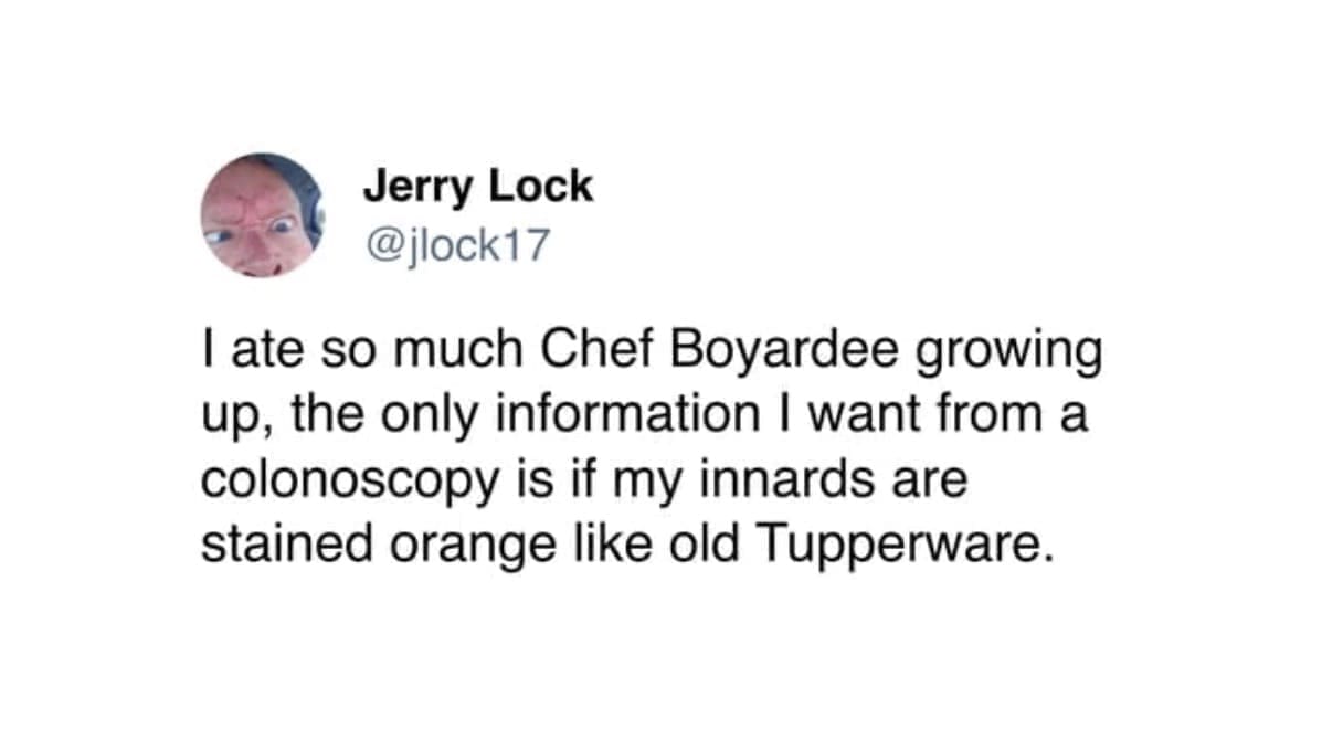 funny memes I ate so much Chef Boyardee growing up, the only information I want from a colonoscopy is if my innards are stained orange like old Tupperware.