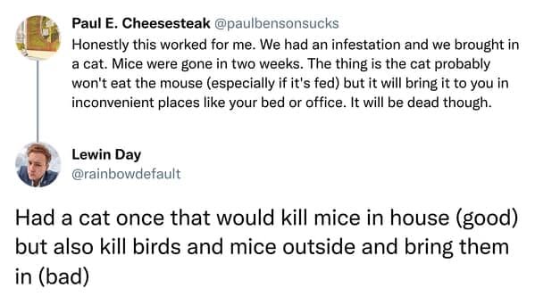 A hilarious text thread between a landlord and tenant where the landlord hires a cat to deal with a mouse issue