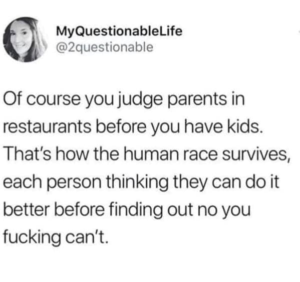 After diving into this collection of parenting memes and funny parenting jokes, you'll likely have found yourself nodding in recognition and laughing out loud at the absurdity of it all. Navigating through these images feels like commiserating with fellow parents over a shared bottle of wine (or two). Whether you're a seasoned parent or a newbie navigating the trenches of parenthood, these memes offered your a humorous respite from the chaos of daily life.
