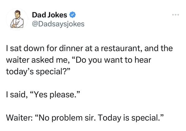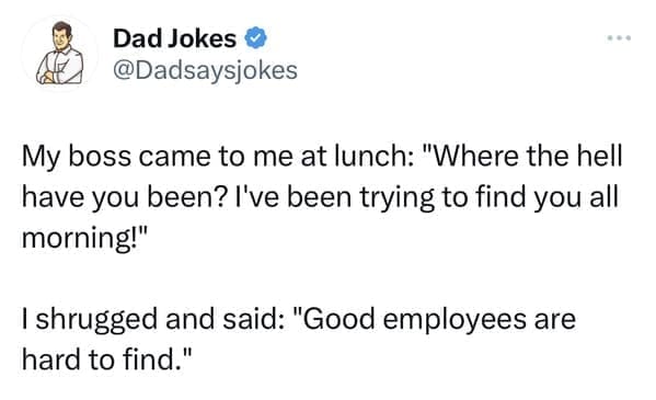 Ready for more groan-worthy humor? Explore our archives for a treasure trove of dad jokes, puns, and comedic gems guaranteed to make you cringe (in the best way possible). From classic one-liners to hilarious anecdotes, there's no shortage of laughs to be found in the world of dad humor. So grab your sense of humor (and maybe a dad hat), and prepare for a journey through the groan-inducing world of dad jokes.