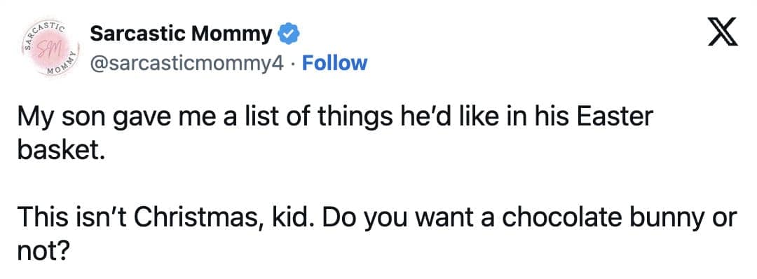 Get ready to scroll through 43 of funny Easter tweets we could find. We've got tweets that perfectly encapsulate the struggle of navigating awkward family conversations at the Easter dinner table. There are hilarious observations about the questionable fashion choices that often emerge during Easter gatherings. And of course, no Easter tweet collection would be complete without some good-natured ribbing of the Easter Bunny himself (sorry, bunny, but those oversized ears are just begging to be made fun of).