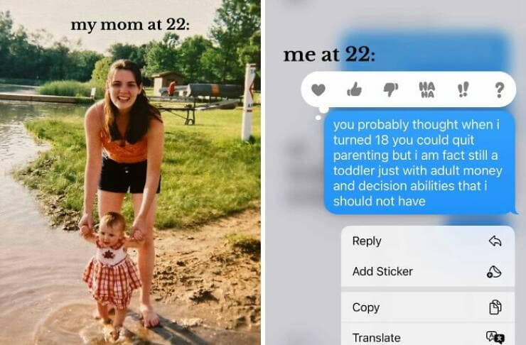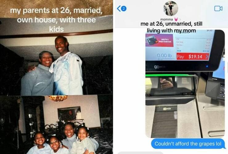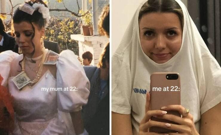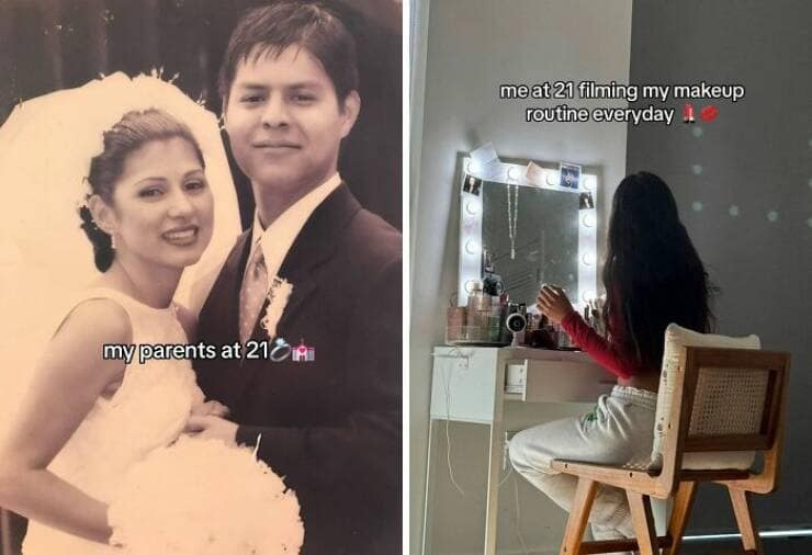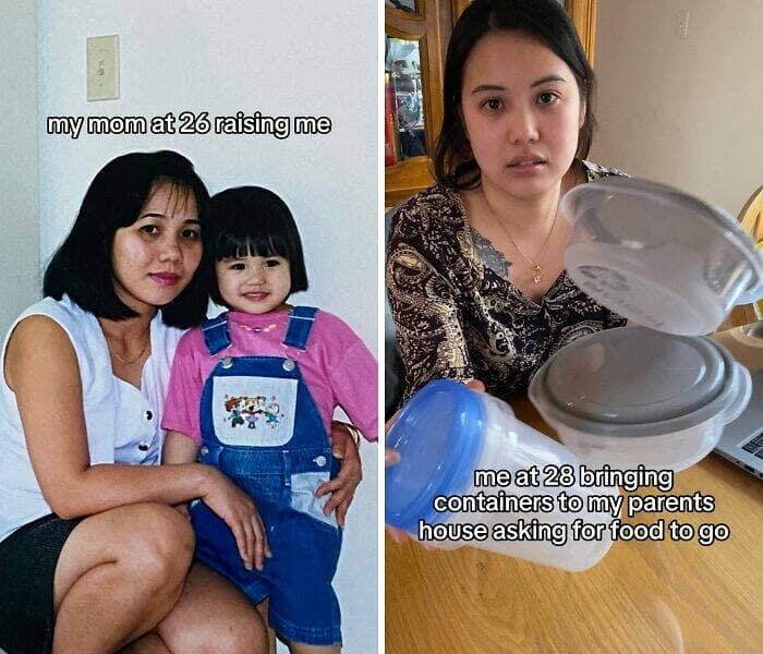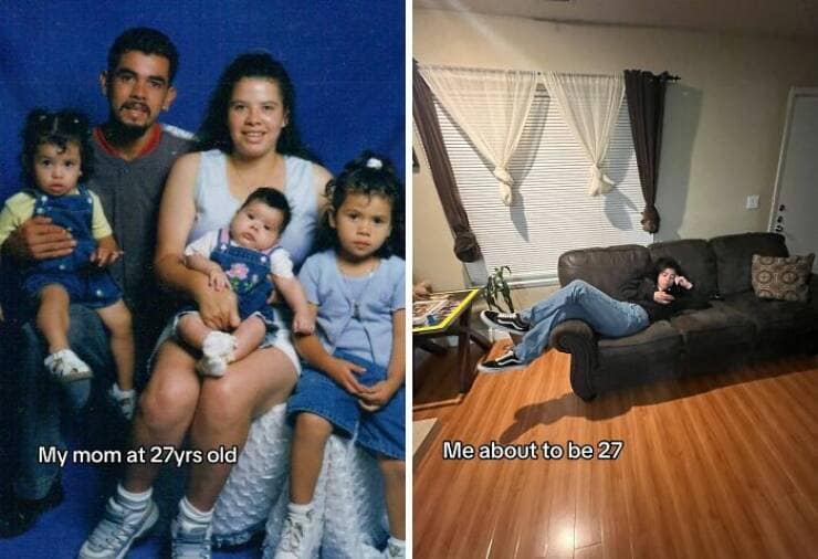 You've just scrolled through a side-splitting slideshow of 35 "My Parents at 25 vs. Me at 25" comparisons that had you alternating between laughter and mild existential dread. Perhaps you encountered a split image featuring a young couple on their honeymoon, swimming in the crystal-clear waters of some exotic beach (apparently, vacations were more affordable back then too?), while the other half showcased you sheepishly posing in front of a gas station on your latest road trip (because scraping together enough for a tank of gas is a vacation in itself these days). This relatable image perfectly captured the shift in priorities and economic realities faced by your generation.