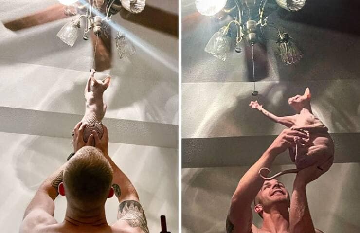 Every Night My Husband Holds Our Sphynx Cat Up To Fight His Nemesis: The Ceiling Fan Pull