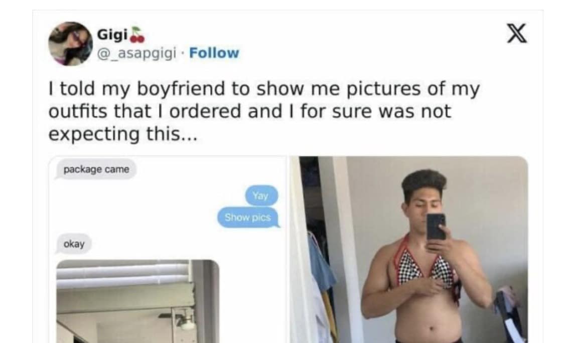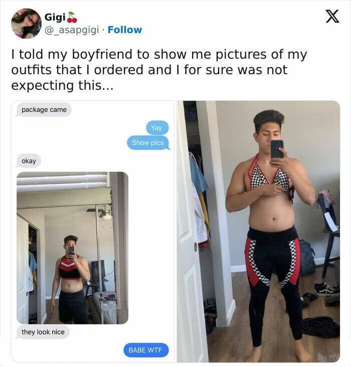Get ready to see coupledom redefined through the lens of hilarious eccentricity with this collection of 40 photos showcasing boyfriends going above and beyond (in their own special way) to show they care. From the boyfriend who recreates your favorite childhood cartoon character out of vegetables for your birthday dinner ("Happy birthday! Here's your broccoli Bob!") to the one who serenades you with a song entirely composed of dog barks (intentionally...we think), these boyfriends prove that love can be equal parts sweet and utterly bizarre. Prepare for photos that capture the boyfriends who meticulously plan elaborate scavenger hunts that end with a coupon for 10% off at your favorite store ("It's the thought that counts, right?"), the ones who knit you a life-sized scarf in the shape of a cat ("It's practical! And fashionable!"), and the hopeless romantics who attempt (and hilariously fail) at baking a heart-shaped cake ("Nailed it?"). Whether your significant other leans towards sweet gestures or spectacular goofiness, this collection is guaranteed to have you chuckling in recognition and appreciating the unique brand of weirdness that keeps love interesting.