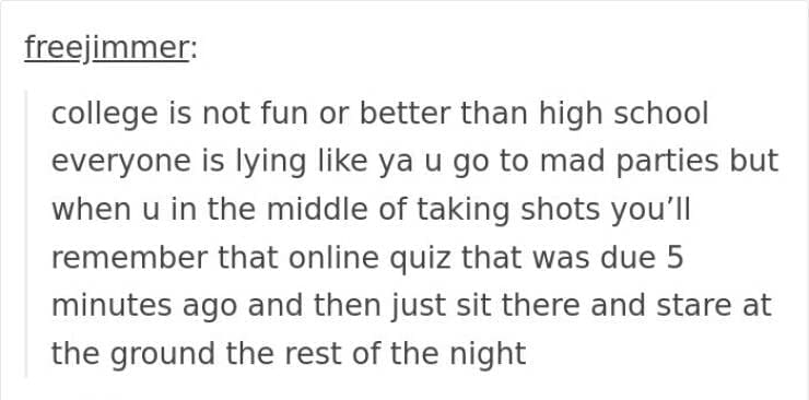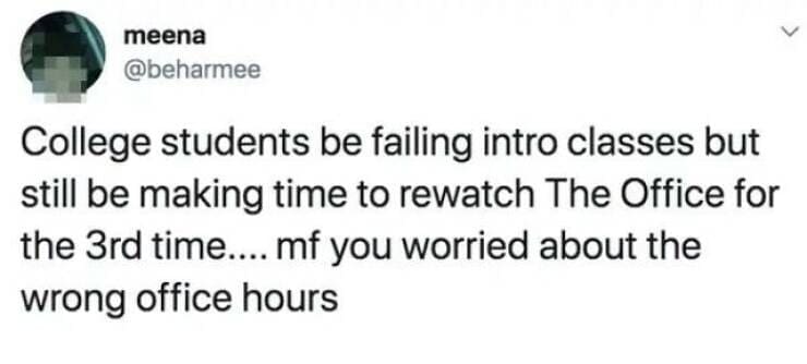 Scrolling through this collection of college memes was like taking a nostalgic trip down memory lane (or should we say, Ramen noodle lane). You've laughed, you've cried (from laughter, mostly), and you'll definitely be wanting to share a few of these with your fellow sleep-deprived classmates. After all, what better way to cope with the existential dread of looming deadlines and the ever-present fear of a pop quiz than through the shared misery – er, humor – of relatable memes?