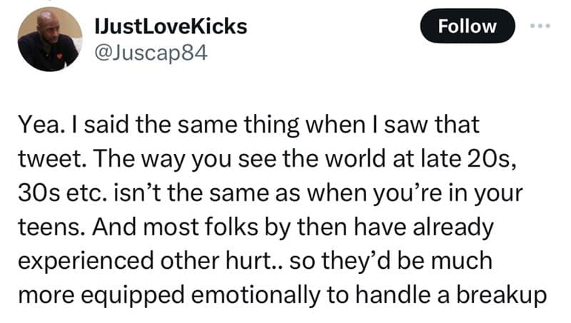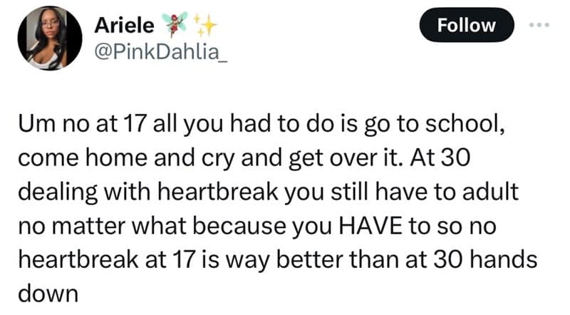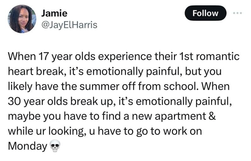 Our collection of heartbreak memes explores the emotional rollercoaster of love lost at different ages. From the melodramatic woes of teenage heartbreak to the cynical humor of adult relationships, these memes capture the essence of heartache with a comedic twist. Each meme, inspired by tweets, offers a humorous take on the trials and tribulations of breaking up, showcasing the stark contrasts and surprising similarities between heartbreak at 17 and in your 30s. Dive into these relatable and laugh-out-loud moments that make the pain of heartbreak a little easier to bear.