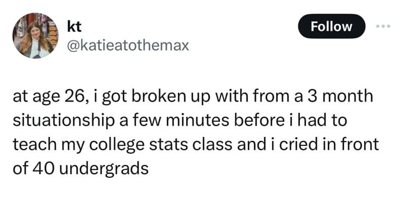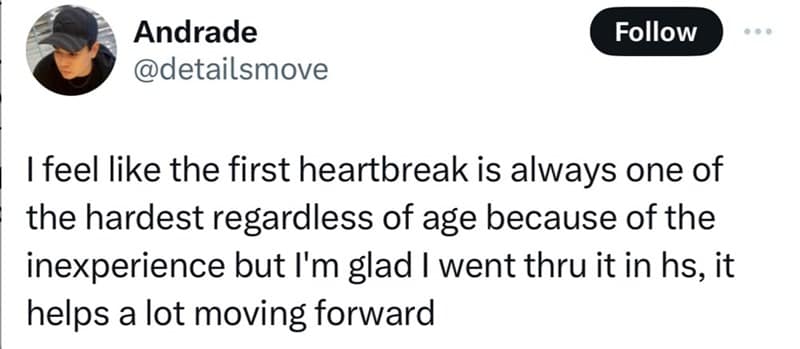 After scrolling through these heartbreak memes, you undoubtedly found yourself laughing and nodding in agreement. The tweets struck a chord, resonating with the raw emotions of teenage love and the more complex heartbreaks of adulthood. Each of them, with its blend of humor and relatability, provided a lighthearted perspective on the universal experience of heartbreak. We hope you appreciated the clever commentary on the different ways heartbreak manifests at various life stages, making the collection both entertaining and oddly comforting.