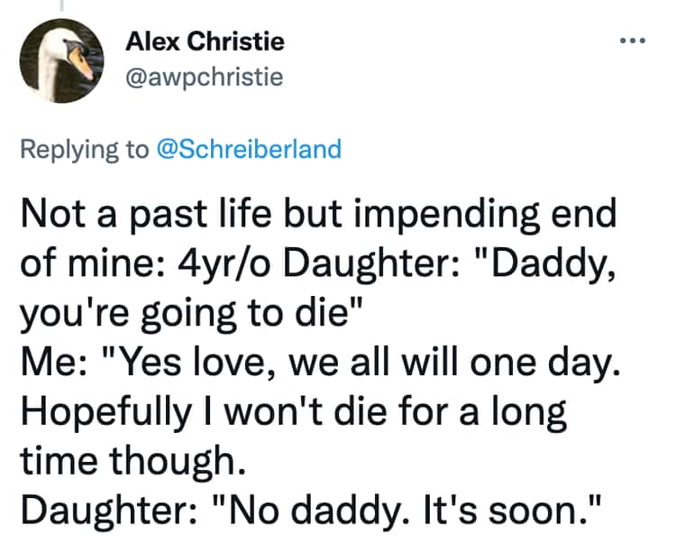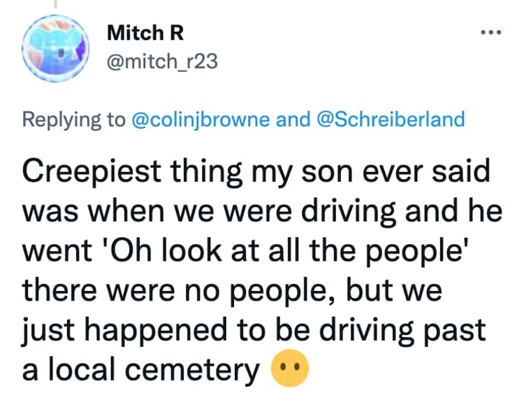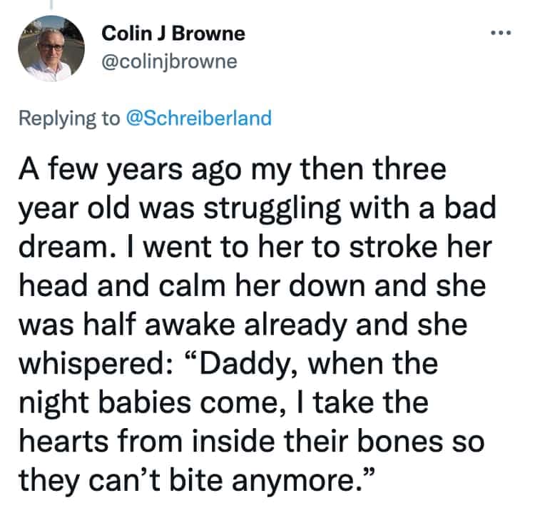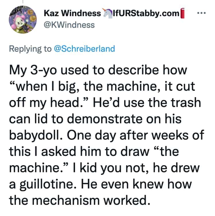 Ah, children. Bundles of joy, sure, but also champions of the unexpected, the nonsensical, and the downright creepy. This collection features 30 tweets from parents who've encountered the unsettling side of their little angels. Prepare for unsolicited pronouncements about past lives, hair-raising claims of imaginary friends, and observations that leave you questioning your parenting skills (and maybe your sanity).