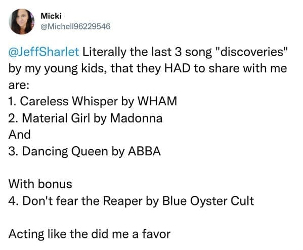 Our collection of 25 kids memes showcases the funniest and most relatable moments when kids encounter their parents' old music. These memes feature tweets from parents who shared their children's bewildered reactions to classic tunes, highlighting the generational gap in music appreciation. Each tweet captures a unique and hilarious moment, from kids mistaking iconic bands for something completely different to their confusion over why anyone would listen to "that old stuff." These kids memes are a delightful mix of humor and nostalgia, perfect for anyone who loves music and funny family moments.