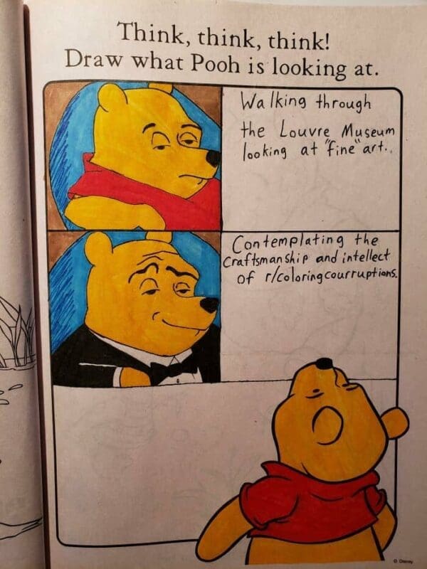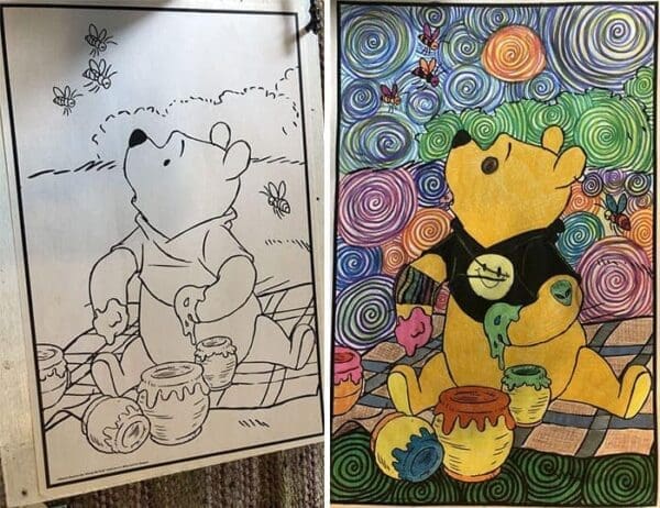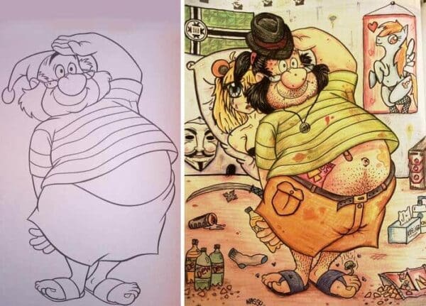 Coloring books are typically the realm of innocent fun for kids, but when adults get their hands on them, things can take a hilariously dark turn. Welcome to the world of corrupted coloring books, where adults add their twisted sense of humor to otherwise innocent pages. These 40 examples showcase the funniest and most creative ways people have transformed kids' coloring books into laugh-out-loud masterpieces. Get ready to see your favorite childhood characters in a whole new, and sometimes disturbing, light.