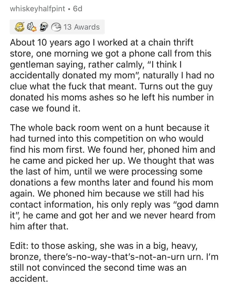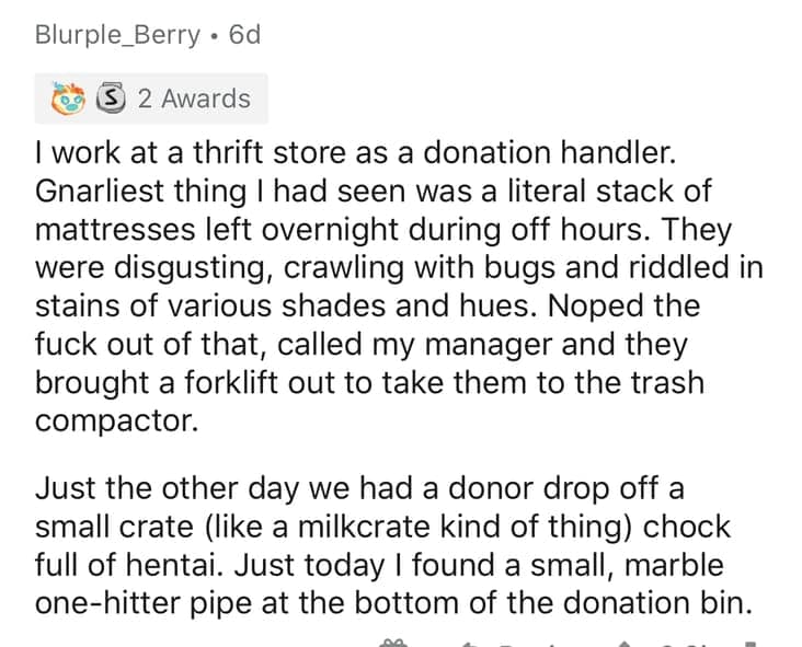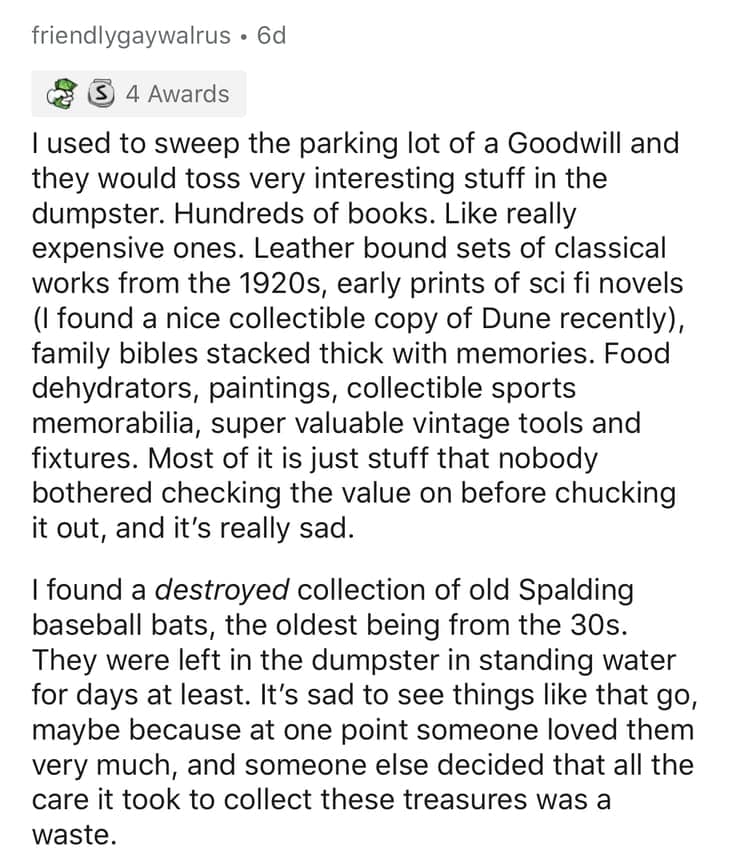 When I was a teenager, I worked at a thrift store for a summer. One day, we received an old, dusty accordion. No one knew how to play it, but it quickly became the centerpiece of our oddball collection of weird stuff donated to goodwill. That summer, I learned that people will donate the most bizarre items, probably thinking they’re doing some good. Turns out, the employees are the real heroes, sorting through these strange treasures.