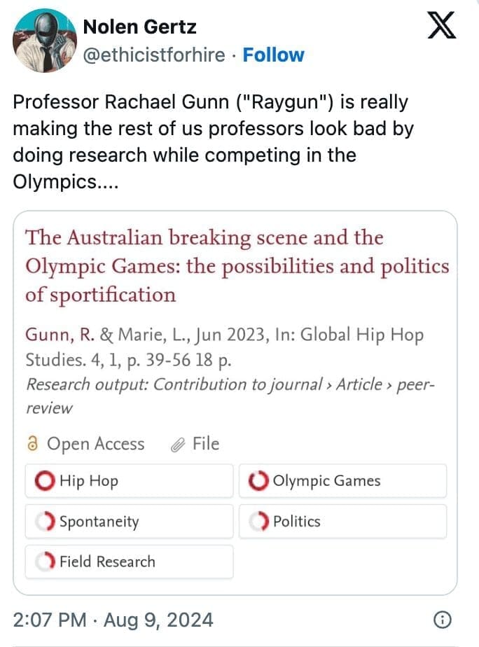 If you’re looking for a laugh or just curious about how an academic became a meme sensation, these 32 Rachael Gunn memes are sure to entertain. These Raygun memes perfectly encapsulate the internet’s reaction to her unexpected Olympic appearance. From poking fun at her awkward dance moves to celebrating her academic achievements in a hilariously ironic way, these gems highlight the contrast between her day job as a professor and her Olympic dreams. Whether you're a fan of the 2024 Olympics or just love a good viral meme, these posts offer a lighthearted look at how the Raygun became the unlikely star of the Games.