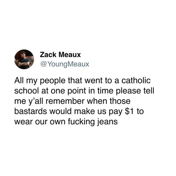 If you’ve ever attended a Catholic school, you know the unique blend of strict rules, uniforms, and religious rituals that fill your memories. This collection of Catholic school memes nails the experience, from the constant fear of breaking the dress code to the confusing feeling of praying before exams (as if divine intervention would make algebra any easier). You’ll recognize the overly long masses, the dreaded confessions, and the never-ending reminders that Jesus is watching. These memes highlight the humor in the absurd—whether it’s the impossible-to-meet uniform standards or the strict hierarchy of guilt.