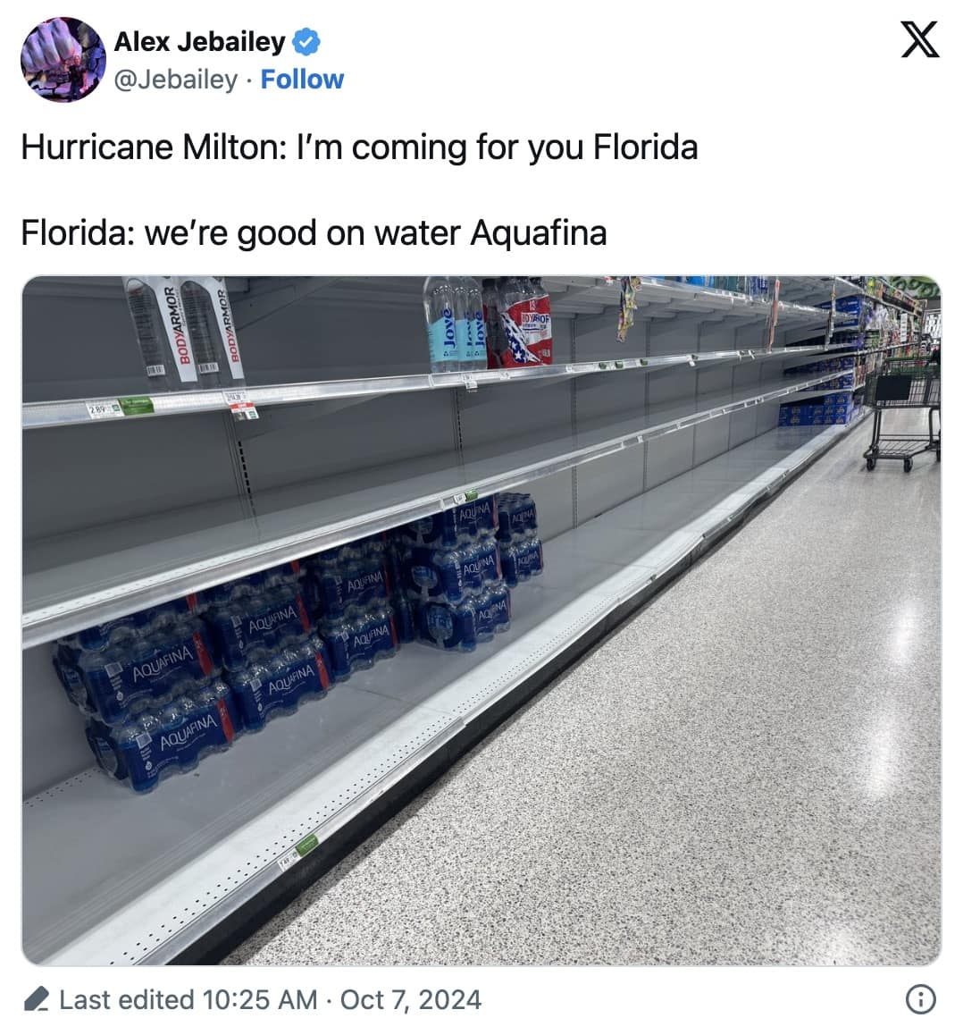 These 25 Hurricane Milton memes blend humor with the realities of dealing with a huge and scary storm. Whether it’s jokes about the frantic rush to buy supplies, jabs about Floridians’ laid-back attitude toward storms, or sarcastic takes on the unpredictability of the weather, this collection captures the lighthearted side of the storm.