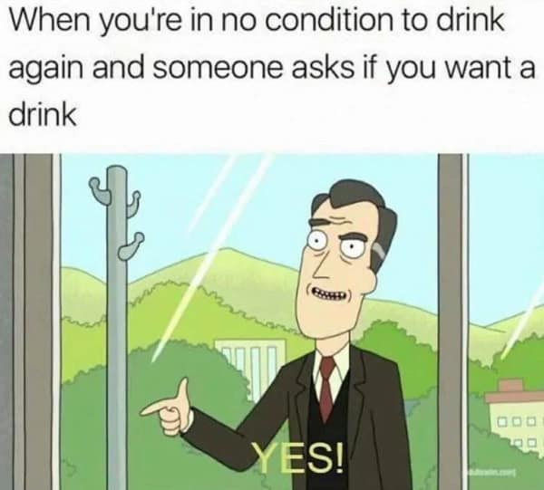 This collection of alcohol memes and hangover memes is a mix of hilarious illustrations, relatable text posts, and funny photos that perfectly depict the struggles of drinking in your 30s and beyond. You'll see memes about the anticipation of a night out, the inevitable regrets the next morning, and the sheer exhaustion of trying to keep up with younger party-goers.