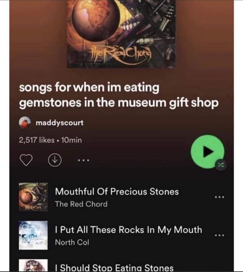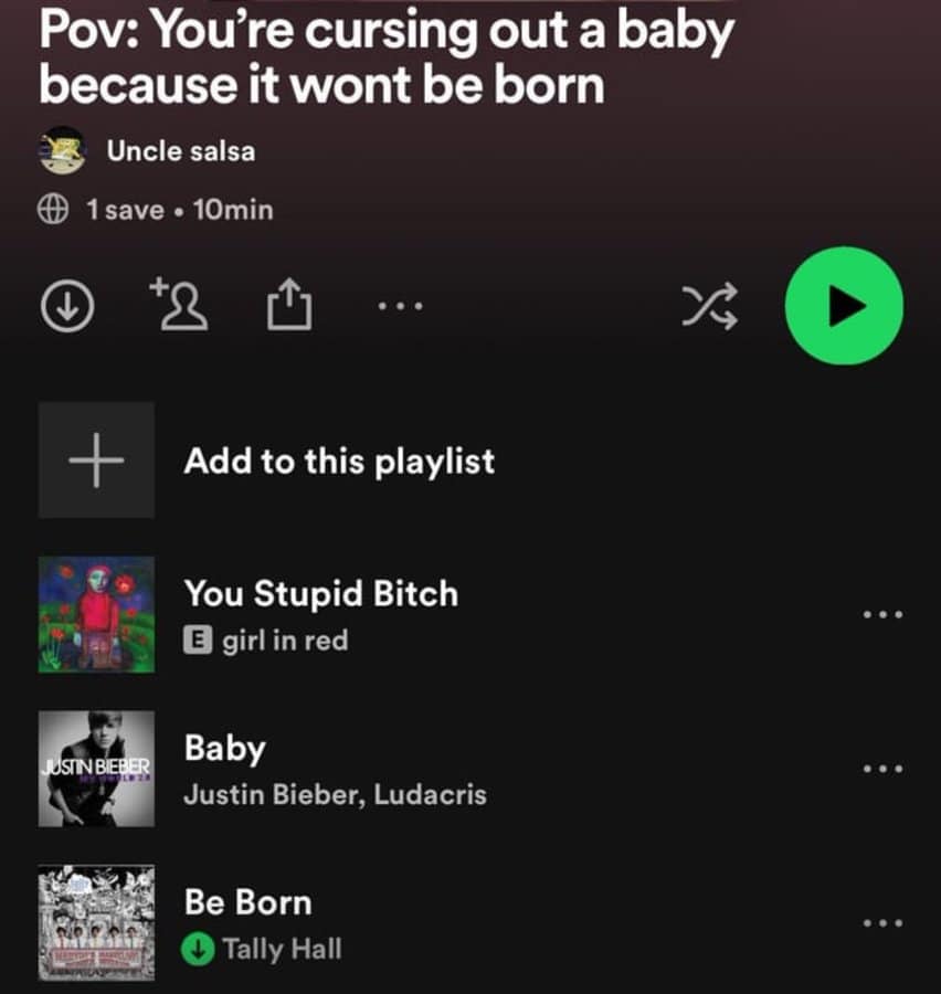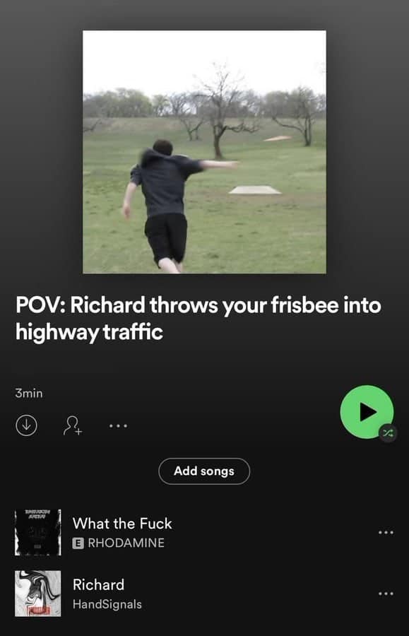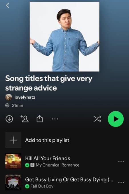 This compilation delves into the bizarre realm of Spotify playlists that make you question the curators' thought processes. Each image showcases a playlist with themes so oddly specific, they border on the absurd. From titles like "Songs to Yell at Pigeons To" to "Melodies for Imaginary Pirate Battles," these funny Spotify playlists highlight the limitless creativity—or perhaps the boredom—of music enthusiasts. The unusual music playlists not only provide a good laugh but also serve as a reminder that musical expression knows no bounds. It's a journey through the quirkiest corners of music streaming services, where anything goes and apparently does.