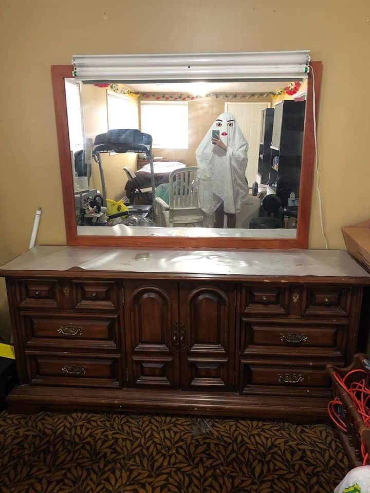 This collection showcases the valiant efforts of individuals attempting to sell mirrors without becoming the unintended centerpiece of their own listings. Each photo captures the humorous side of product photography mishaps, where avoiding one's reflection proves more challenging than anticipated. You'll see inventive strategies ranging from creative use of costumes to downright bizarre positioning—all in the name of achieving that perfect, person-free shot. These images highlight not only the quirks of online selling but also the common struggles faced in the world of e-commerce. They touch on themes of funny product photos, accidental selfies, and the lengths people will go to maintain a semblance of anonymity while marketing their wares.