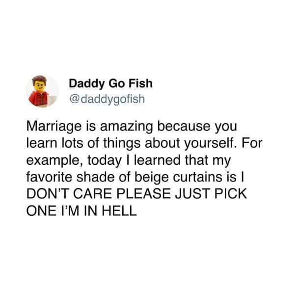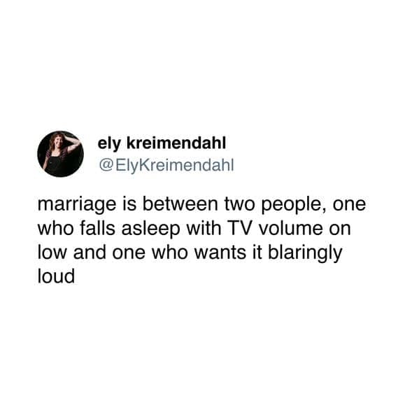 This compilation of marriage memes exposes the silent undertones of a lifelong bond, as if someone planted a camera in the marital living room and hit record. Within these images, funny marriage tweets highlight those minor clashes over thermostat settings and the artful skill of feigning interest in each other’s hobbies.