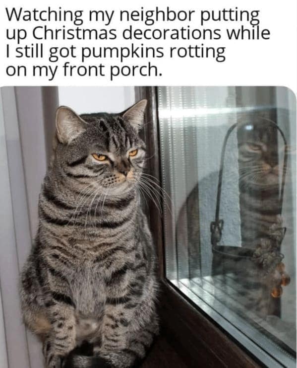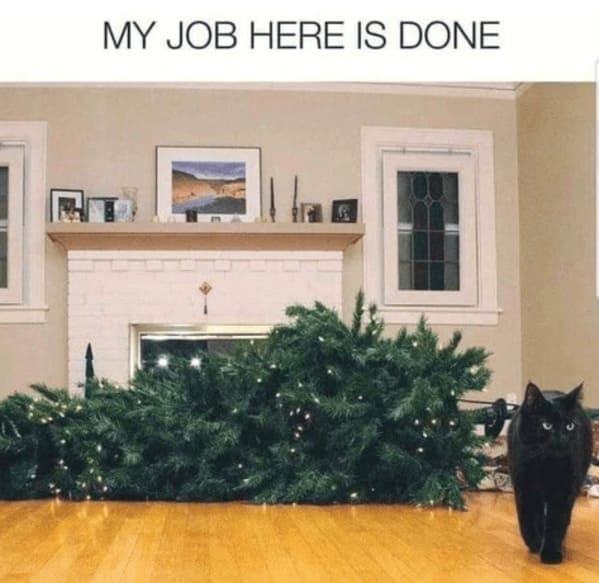 This assortment of Christmas cat memes brings forth scenes where wreaths tangle in whiskers and bows discover their true purpose as chew toys. Within the images, Christmas memes fade into the background as four-legged protagonists upend the notion of tidy celebrations. Picture a cat perched smugly inside a half-decorated tree, or batting at ornaments as if testing gravity’s patience. The subtle humor arises from knowing that every ribbon and fragile decoration stands no chance against focused claws. Collectively, these photos acknowledge that despite all attempts at control, nature—in this case, furry and cunning—prevails. The resulting laughter consoles us that if we cannot have perfect order, at least we have these Christmas cat memes to confirm we are not alone in our decorative downfall.