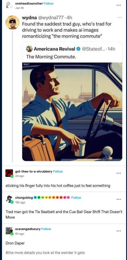 On the AI trad dude…it’s the way he’s holding the turn signal indicator like it’s a column shifter for me.