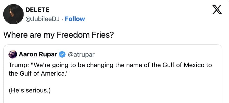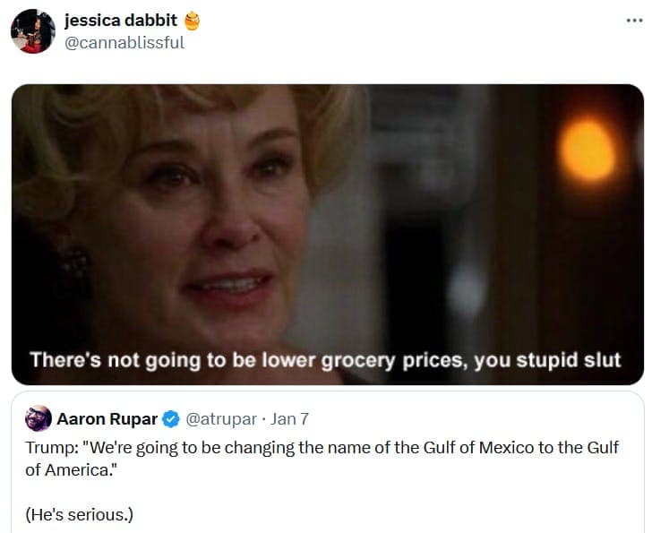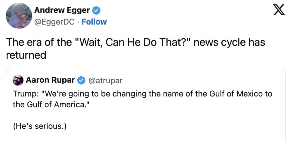 This curated set showcases a spectrum of Gulf of America memes balancing humor and exasperation after Donald Trump's comments. They reflect the flurry of social commentary after the soon to be President said what he wanted to do when asked about the price of eggs, of all things. Each of these funny reactions underscores how comedic synergy unfolds when individuals from all backgrounds weigh in—be it the everyday pun enthusiast or the dedicated critic of bombastic announcements. A few visuals might depict hastily edited maps wherein entire swaths of coastline are retitled with absurd patriotic flair, or camera captures of spirited sign-carrying protestors giving their spin on the proposed name change. Underneath the Trump memes, though, is a reflection on how swiftly a single statement can prompt an entire wave of digital artistry. The comedic narrative emerges through satirical references to corporate rebranding gone wild, jabs at the complexities of political boundaries, and the eternal question: does flipping a place name make it any more ours? Through it all, the message is straightforward: if you’re going to stir up cartographic chaos, prepare for an internet tsunami of Gulf of America memes. I GUESS.