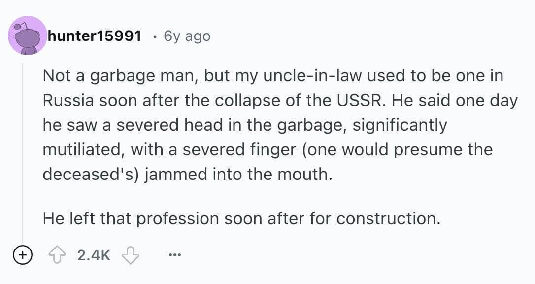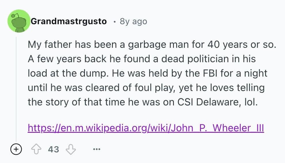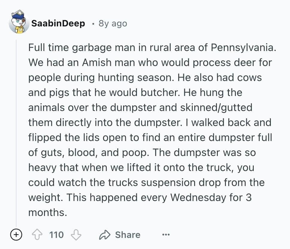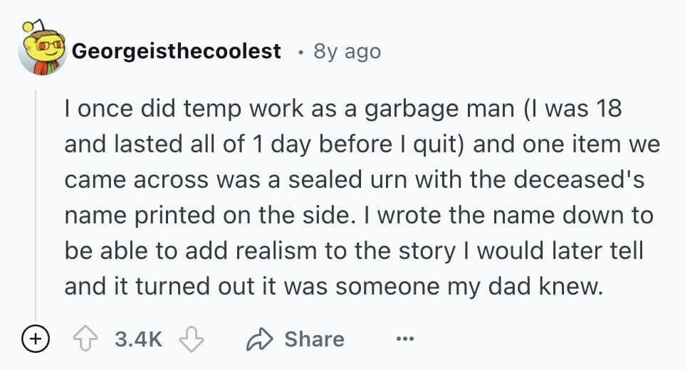 You just read 20 stories about trash collectors finding things that made you laugh, cringe, and maybe even question humanity. From bizarre heirlooms to outright horrors, each tale was a mix of humor and secondhand embarrassment. By the end, you were left with a newfound respect for trash collectors—and maybe even a desire to peek into your own garbage.