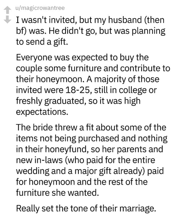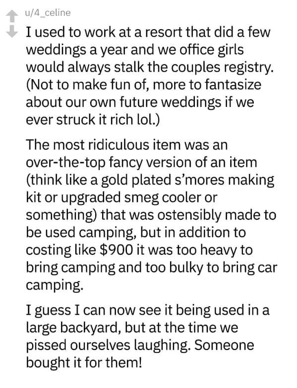 This set of 20 photos captures the most outrageous newlywed demands that guests discovered upon politely checking for gift suggestions. You’ll see guests reeling at the sight of a gold-plated waffle maker with a price tag that could wipe out a small savings account, or a request for custom monogrammed towels so fancy you’d hesitate to even dry your hands on them. As you scroll through the snapshots, you’ll notice a consistent theme of couples banking on others’ generosity to acquire questionable marriage gift requests that, frankly, test the limits of polite society. Some revolve around bizarre honeymoon fund add-ons, from private yacht rentals to five-star spa weekends, all apparently disguised as thoughtful “support” for the newly minted couple. Sprinkled throughout these photos are the occasional cross-stitched decorative pillows bearing the couple’s initials—like a constant reminder of how thoroughly they believe in the power of gift-giving to fulfill their every whim. It’s one part comedy, one part mild exasperation, and a reminder that, for some soon-to-be spouses, no price tag is too high when someone else is paying. Embrace these confessions of horrified guests who realized they’d have to purchase an entire china set—just because two people decided to tie the knot.