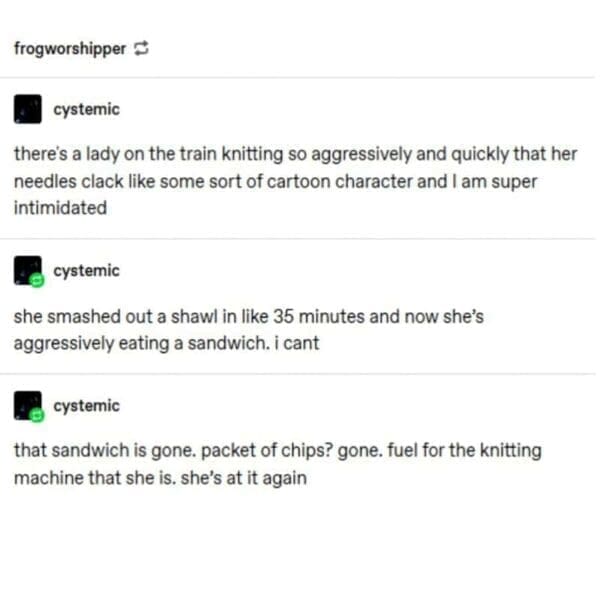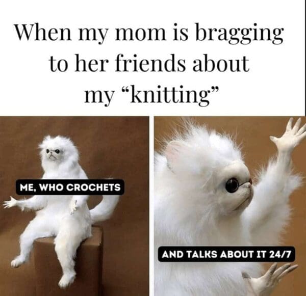 Within these funny crochet memes, you’ll find the day-to-day frustrations of crocheters, from losing a favorite hook to miscounting stitches at the worst moment. Many craft memes emphasize knitting memes as well, acknowledging that whether your weapon of choice is a crochet hook or a pair of needles, you’re bound to face a dizzying array of partial projects. There’s also a playful nod to yarn jokes sprinkled throughout, highlighting the universal challenge of resisting yet another skein purchase. Each piece stands as an ode to all those late nights spent dreaming up patterns you’re not sure you’ll ever complete. And if you’ve ever tried to teach a friend, only to watch them stare blankly at you while holding loops in unrecognizable shapes, you’ll laugh (or maybe cringe) at memories of your own crocheting evangelism. Altogether, these funny crochet memes are a warm, slightly mocking tribute to fiber enthusiasts everywhere, providing comedic relief for those moments when you’re convinced you have too many hobbies and not enough hours in a single lifetime.