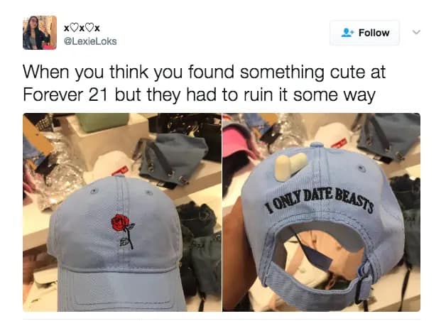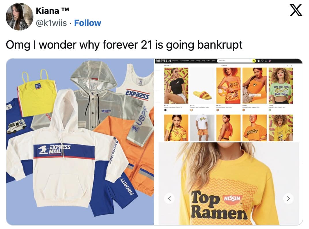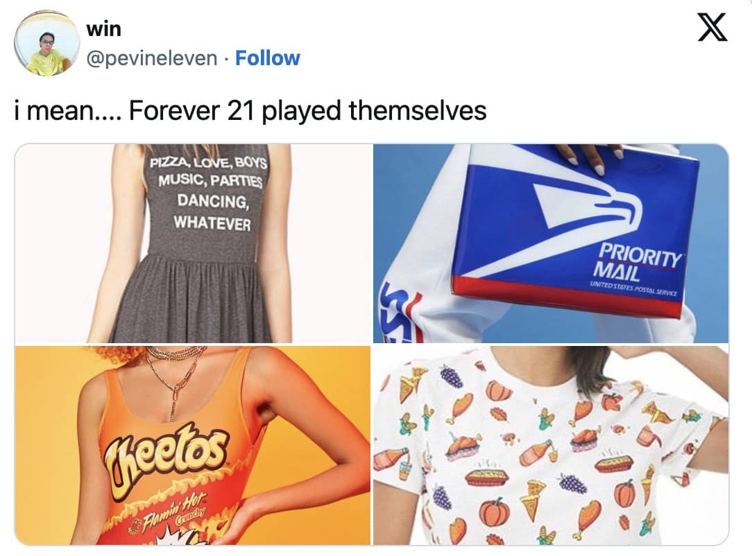 One of the biggest themes in Forever 21 memes is, of course, the retailer’s absolutely baffling branding decisions. While competitors focused on sleek, minimal designs, Forever 21 went all in on collaborations that no one asked for. Was the world really in need of Cheetos-branded sweatpants? Did we ever ask for postal service-themed crop tops? No. And yet, Forever 21 insisted on making them.