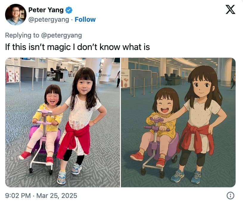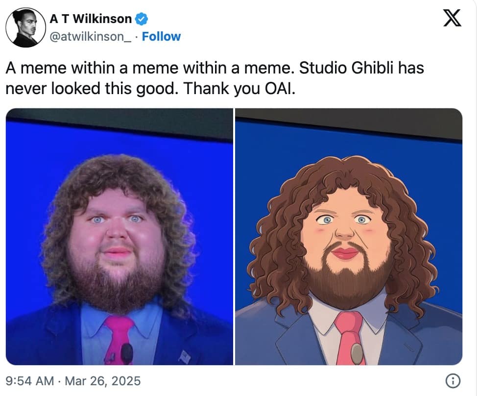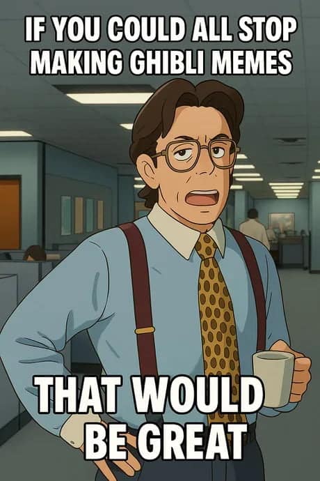 The whole craze highlights one key fact: if given the power, humanity will inevitably use technology for increasingly bizarre purposes. Forget solving world hunger or curing diseases—ChatGPT’s new capabilities are clearly best utilized making Studio Ghibli memes of your neighbor’s annoying dog. After all, why face reality when you can simply Ghiblify memes until your mental breakdown feels magical?