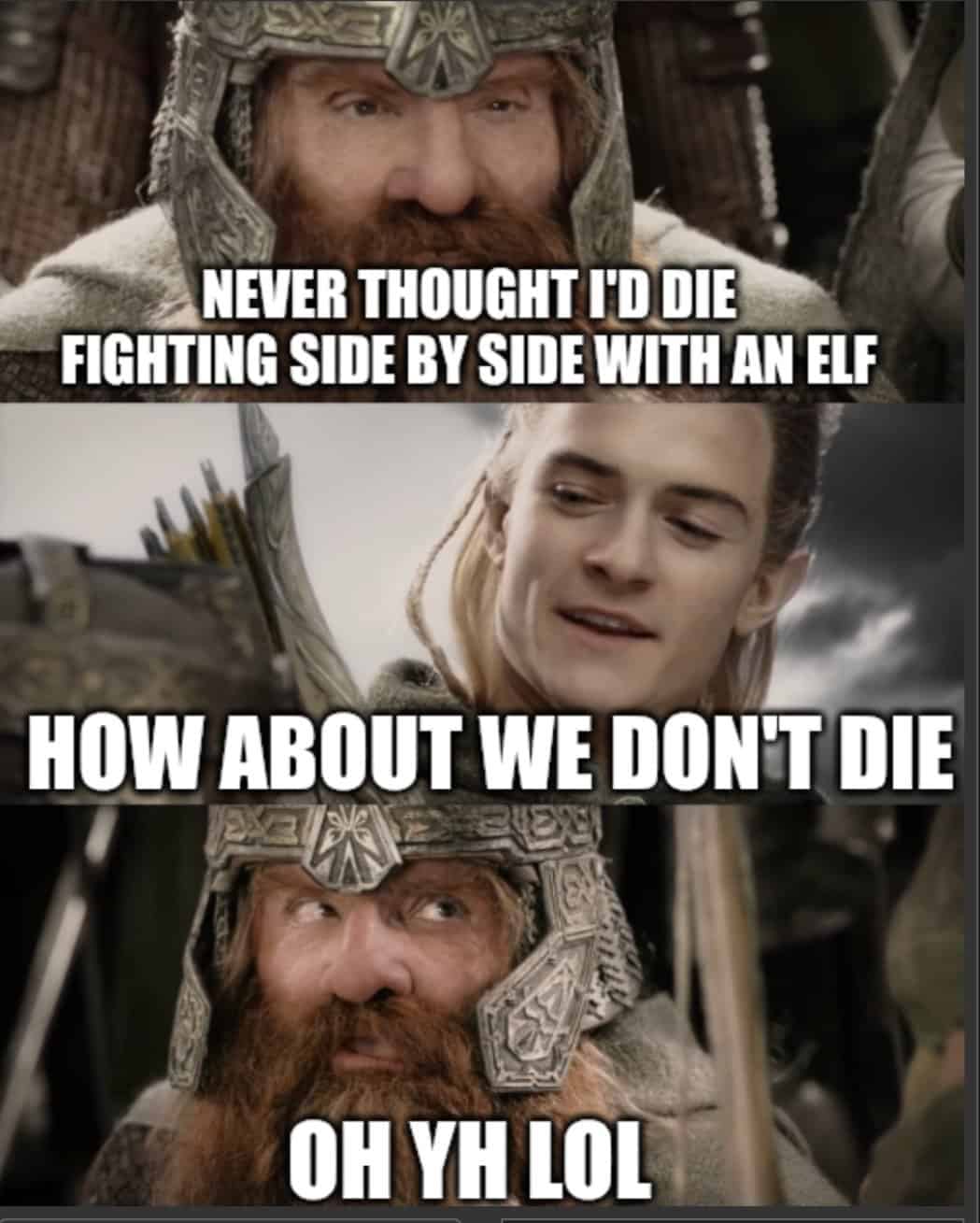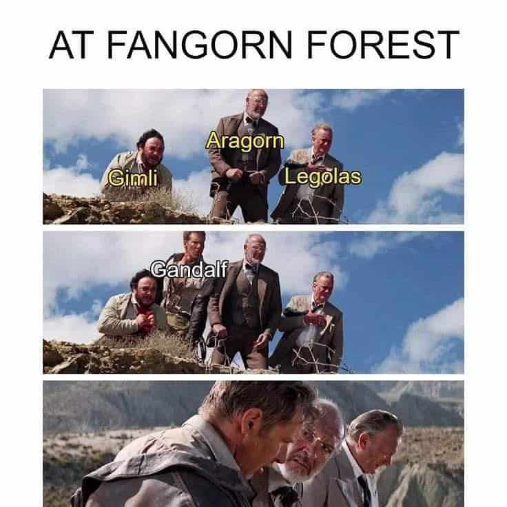 The collection of LoTR memes spans every corner of Tolkien’s cinematic universe. Lord of the Rings memes appear when Aragorn’s rally speech subtitles now read “We clock out at five.” Middle‑earth memes surface through screenshots of Gimli negotiating elevator capacity with his axe. Gandalf memes dominate as the wizard’s stern warnings caption phone‑battery peril. Hobbit humor pops up via Samwise comparing ring‑bearing to carrying emotional baggage for friends who won’t go to therapy. Visual riffs include Sauron’s fiery eye labeled “corporate surveillance camera,” while the One Ring glows beneath text about irresistible online sales. Battle scenes morph into workout comparisons—Uruk‑hai charge equals leg day you skipped. The gallery also pokes at continuity: Legolas surfing shield stairs now represents multitasking while VPN disconnects. Dialogue gets twisted—“It is a strange fate” captions gas‑station prices, and “I can’t carry it for you” becomes coworker refusal to cover shifts.